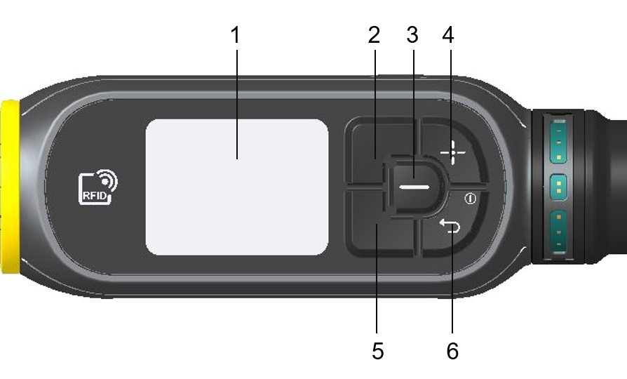6 | on/off button / back button | Physical button for turning on/off the wrench and for moving back from on-screen selection. |