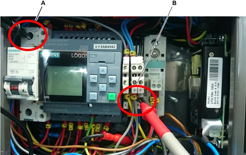 A | Interruttore di arresto di emergenza | B | Pulsante di arresto e rilascio pressione |