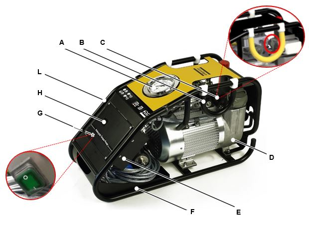 Il funzionamento dell'apparecchiatura consiste nell'innalzare la pressione attraverso l'azione congiunta di una pompa ad ingranaggi e una pompa a pistone fino ad una bassa pressione iniziale. Sono mossi da un motore elettrico monofase, classe di isolamento B (155°C) e IP54, valido per uso continuo o intermittente. Al di sopra di questa pressione iniziale, il flusso della pompa ad ingranaggi viene reindirizzato nel serbatoio in modo che solo la pompa a pistone continui ad aumentare la pressione fino a raggiungere il valore impostato (attraverso una valvola manuale). Questo sistema a doppia pompa consente al motore di ridurre il consumo di corrente senza influire sulle prestazioni.