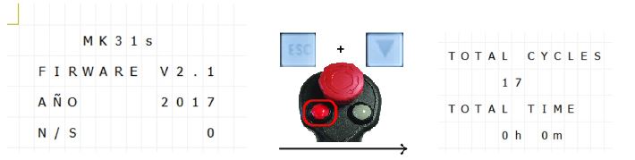 Una volta disinserito l'interruttore, lo schermo visualizza le informazioni sul firmware. Tenere premuto "ESC" + "freccia in basso" + "pulsante ROSSO" nell'impugnatura. Vengono visualizzati le ore e i cicli totali.