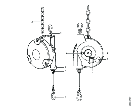 안전 서스펜션 (2), (3) 또는 로드 후크(9)와 같은 안전 장치를 제거하거나 이를 개조하여 무력화하지 마십시오. 고장이나 결함이 있는 경우 밸런서 사용을 중지하고 담당 감독자에게 알리십시오. 예를 들면 밸런서가 체인으로 떨어지는 경우입니다. 교육을 받고 자격을 갖춘 직원이 더 이상의 사용이 가능한지 평가해야 하며 손상된 구성품을 교체해야 합니다.