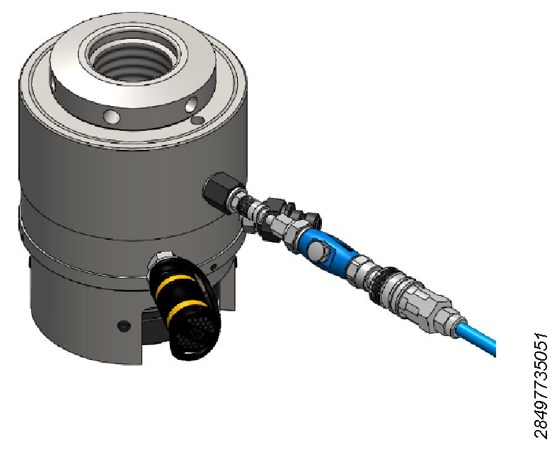 Placer le tendeur sur le goujon jusqu'à ce qu'il repose à plat sur le raccord boulonné. Veiller à ce que la fenêtre d'accès au pont soit orientée radialement vers l'extérieur afin de faciliter l'accès aux trous de la douille pour écrou. Veiller à ce que les raccords hydrauliques soient également orientés radialement vers l'extérieur.