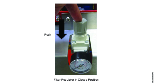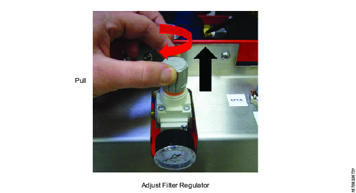 Raccorder l'alimentation principale en air à l'unité de pompe hydraulique. Régler la pression de charge de l'Airbac-S à 4,5 bars, en ajustant le petit filtre-régulateur. Veiller à ce que la molette de réglage soit en position haute et tourner dans le sens horaire pour augmenter la pression d'air à 4,5 bars. Pour diminuer la pression, tourner dans le sens antihoraire. Lorsque la pression de charge d'air cible / requise (c'est-à-dire 4,5 bar) est atteinte, il suffit de « pousser » la molette de réglage vers le bas, en position fermée.