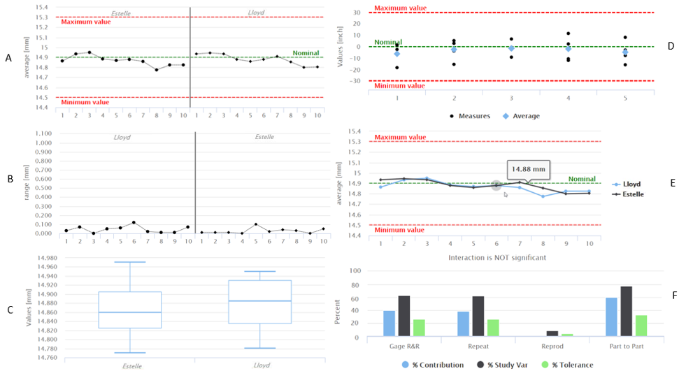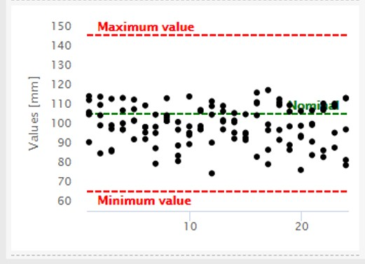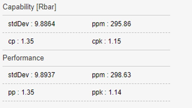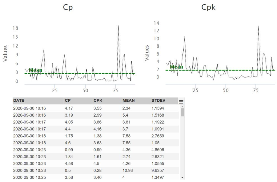 Cp index | The Cp index describes process capability; it is the number of times the spread of the process fits into the tolerance width. The higher the value of Cp, the better the process. |