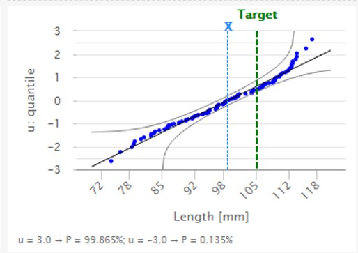 Cmk index | The Cmk index describes the capability corrected for position. It is not much use having a high Cm index if the machine setting is way off center in relation to the middle of the tolerance range. A high Cmk index means, then, that you have a good machine with a small spread in relation to the tolerance width, and also that it is well centered within that width. If Cmk is equal to Cm, the machine is set to produce exactly in the middle of the tolerance range. |