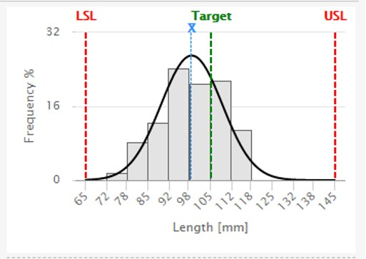 Cpk index | The Cpk index describes the process capability corrected for position. It is not much use having a high Cp index if the process setting is way off center in relation to the middle of the tolerance range. A high Cpk index means, then, that you have a good process with a small spread in relation to the tolerance width, and also that it is well centered within that width. If Cpk is equal to Cp, the process is set to produce exactly in the middle of the tolerance range. |
