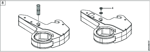 Вставьте стопорный штифт через обе боковые пластины. Расположите вырез штифта на одной линии с отверстием для винта, затем установите фрикционную шайбу и винт (4). Отрегулируйте момент затяжки винта таким образом, чтобы трение шайбы удерживало штифт в положении при перевернутом соединении.