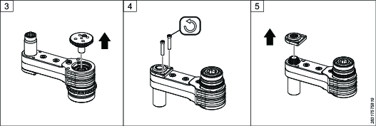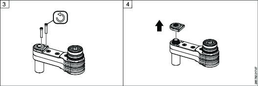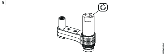 Zamocować narzędzie w imadle. Wyczyścić gwinty. Nałożyć preparat Loctite 2701 lub podobny produkt na adapter panewki łożyska, wcisnąć go do łącznika widełkowego i dokręcić określonym momentem. Uwaga: to nie jest ta sama panewka łożyska co w przypadku głowicy kątowej w Kroku 1.
