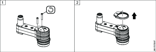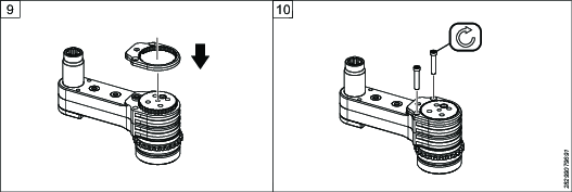 Odwrócić moduł GFA dołem do góry. Włożyć pokrywę wału do obudowy. Jeśli moduł GFA jest wyposażony w klucze, sprawdzić, czy wpusty znajdują się w prawidłowym położeniu.